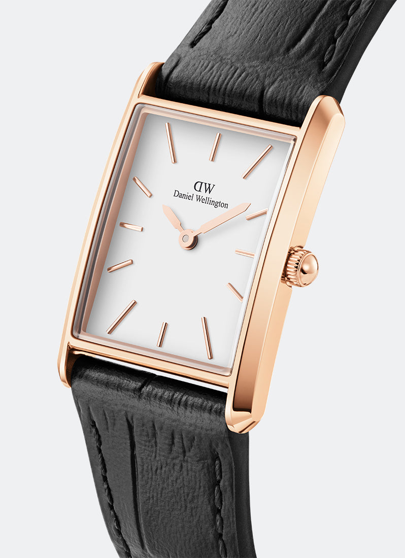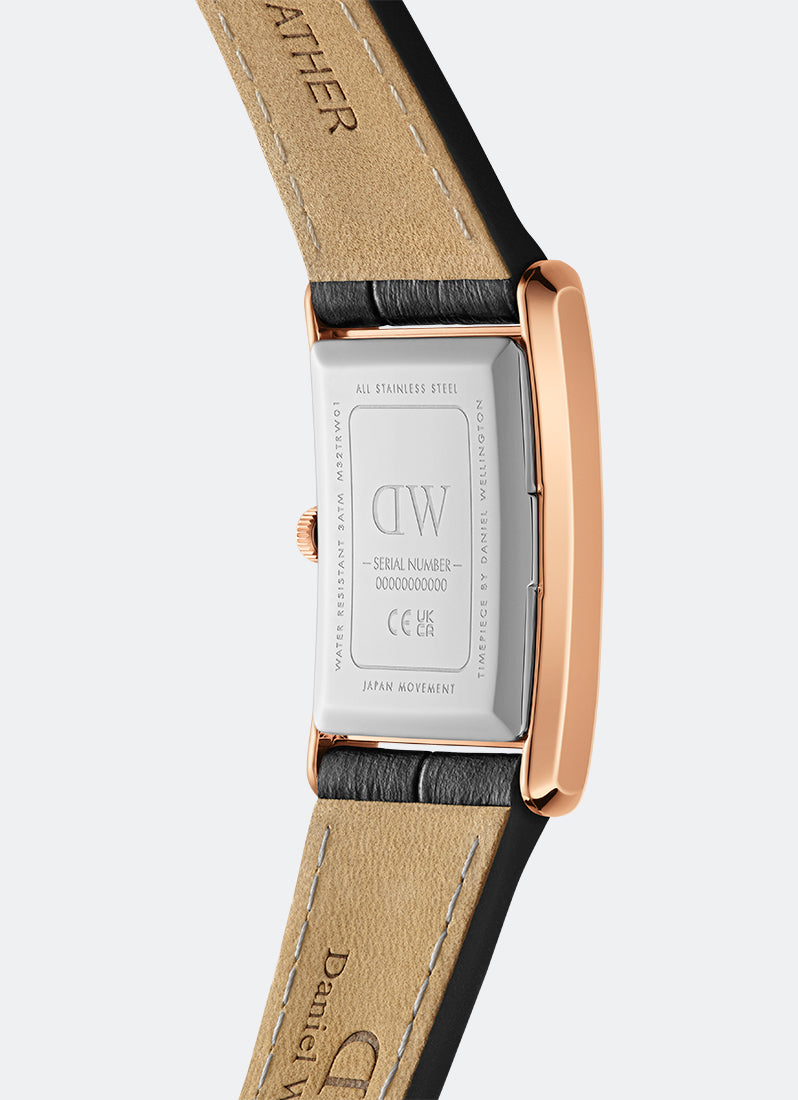 The curved rectangular case of this rose gold watch matches the exact width of its crocodile pattern black leather strap—giving you a seamlessly integrated dial.