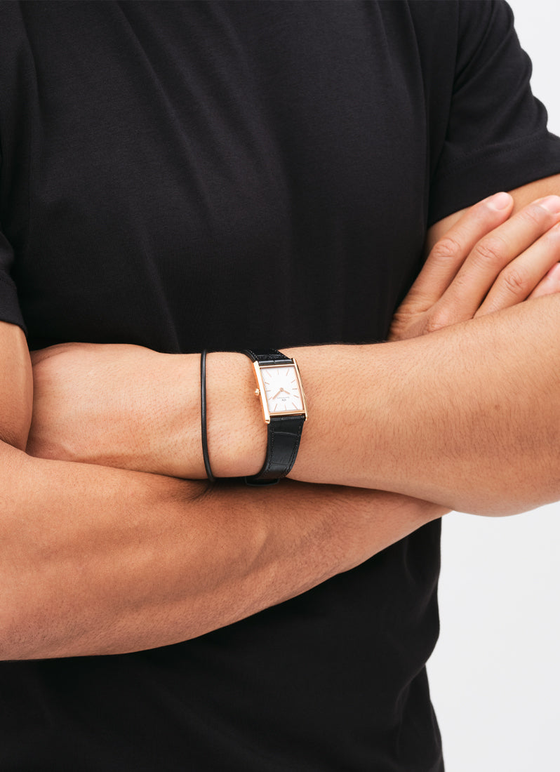 The curved rectangular case of this rose gold watch matches the exact width of its crocodile pattern black leather strap—giving you a seamlessly integrated dial.