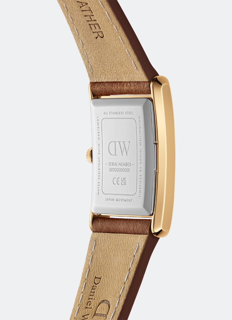 The curved rectangular case of this gold watch matches the exact width of its crocodile pattern brown leather strap—giving you a seamlessly integrated dial.