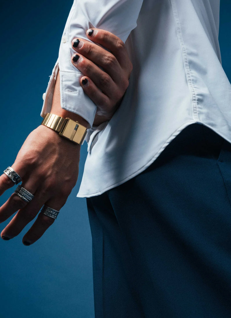 Well-appointed with sophisticated defining traits, the Pulse boasts a slim 26mm 18K gold-plated stainless steel rectangle case with refined sleek edges that meet a tapered bracelet and fastens with a pusher clasp.