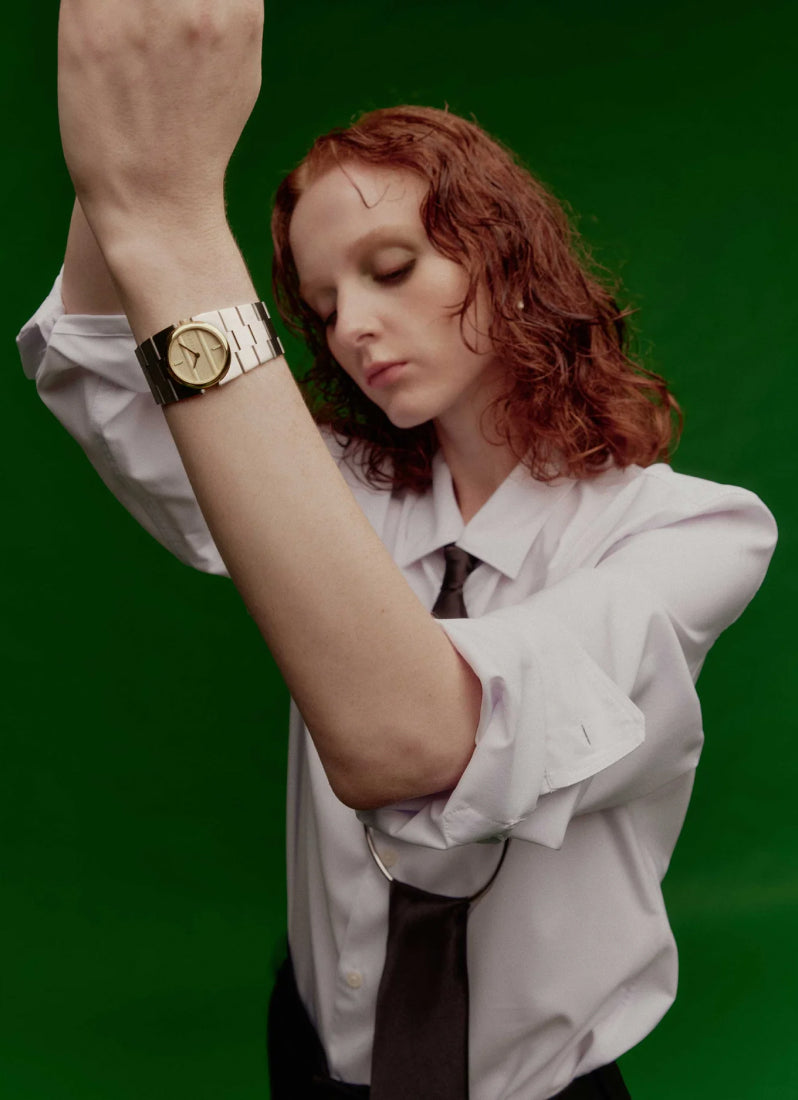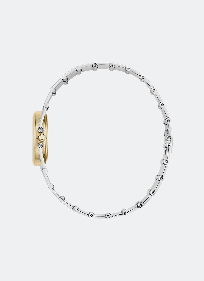 The Sync collection is a celebration of full circle moments, where endings embrace new beginnings. The Sync carries a delicate 25mm circular case, brushed dial and a slender, 28mm tapered bracelet. Each link is constructed with a hinge mechanism, made to seamlessly pivot and mold around the wrist.