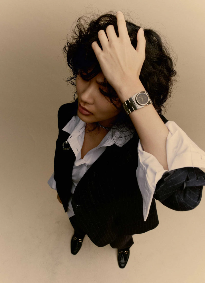 The Sync collection is a celebration of full circle moments, where endings embrace new beginnings. The Sync carries a delicate 25mm circular case, a slender, 28mm tapered bracelet and a brushed dial lensed beneath a smoke- colored crystal. Each link is constructed with a hinge mechanism, made to seamlessly pivot and mold around the wrist.