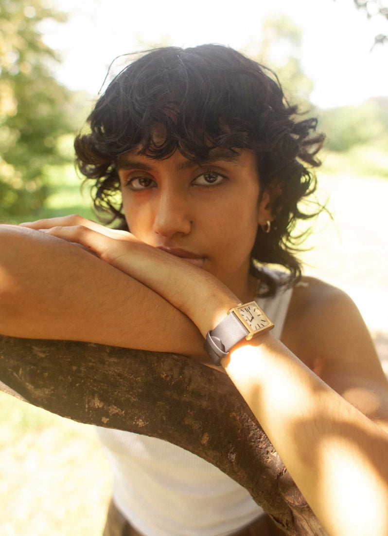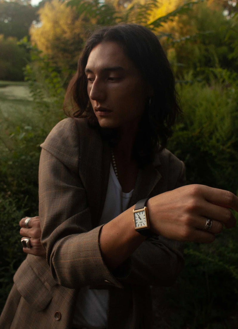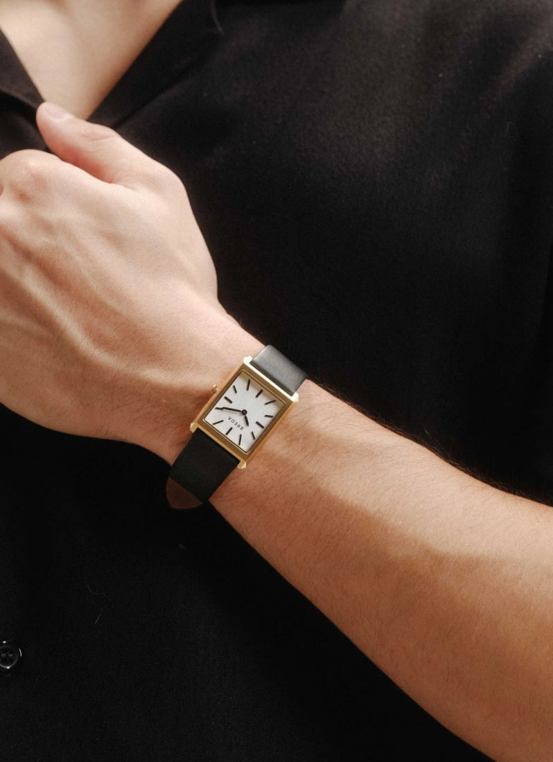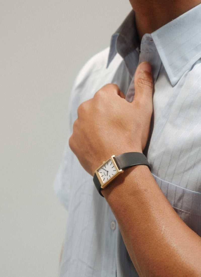 Well-appointed with sophisticated defining traits, the Virgil boasts a slim 26mm 18K gold-plated rectangle case that meets a slender, genuine leather black band. With an ivory brushed dial and refined sleek edges, the Virgil reflects the sentiment of a vintage timepiece.