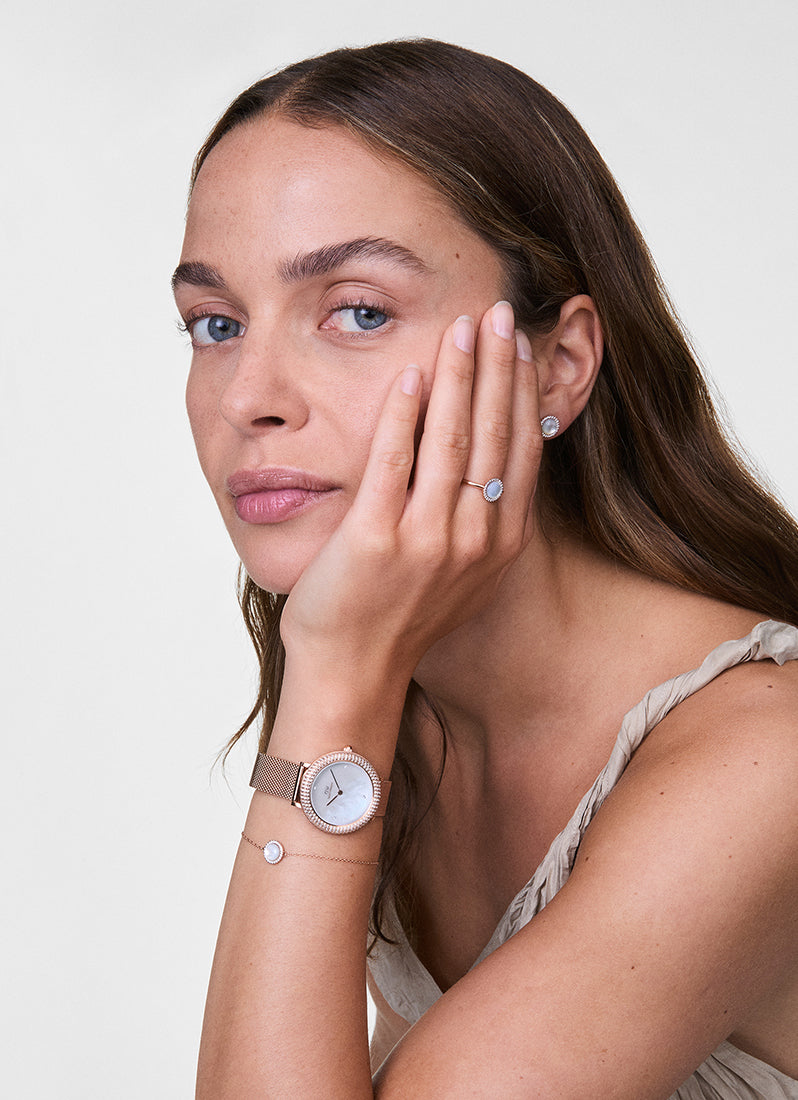 The Crystalline Bezel is the perfect choice when you want to wear something with a luxurious feel. This style statement catches the light and the attention, featuring a dial adorned with Mother-of-Pearl stones and crystal set bezel with a total of 262 stones adding that extra sparkle to this shimmering bezel watch.