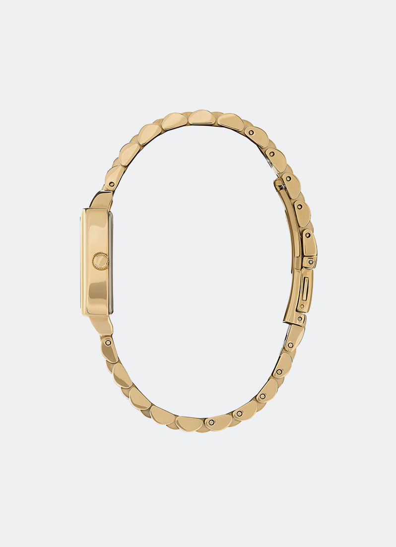 Styled after the traditional London townhouse, this rectangular-shaped case evokes the same timeless and refined appeal of its namesake. Symmetry and minimalism at its core, the powder white dial is paved with crystals and complete with etched markers. Finished with a sleek gold bracelet strap for a contemporary yet classic aesthetic.