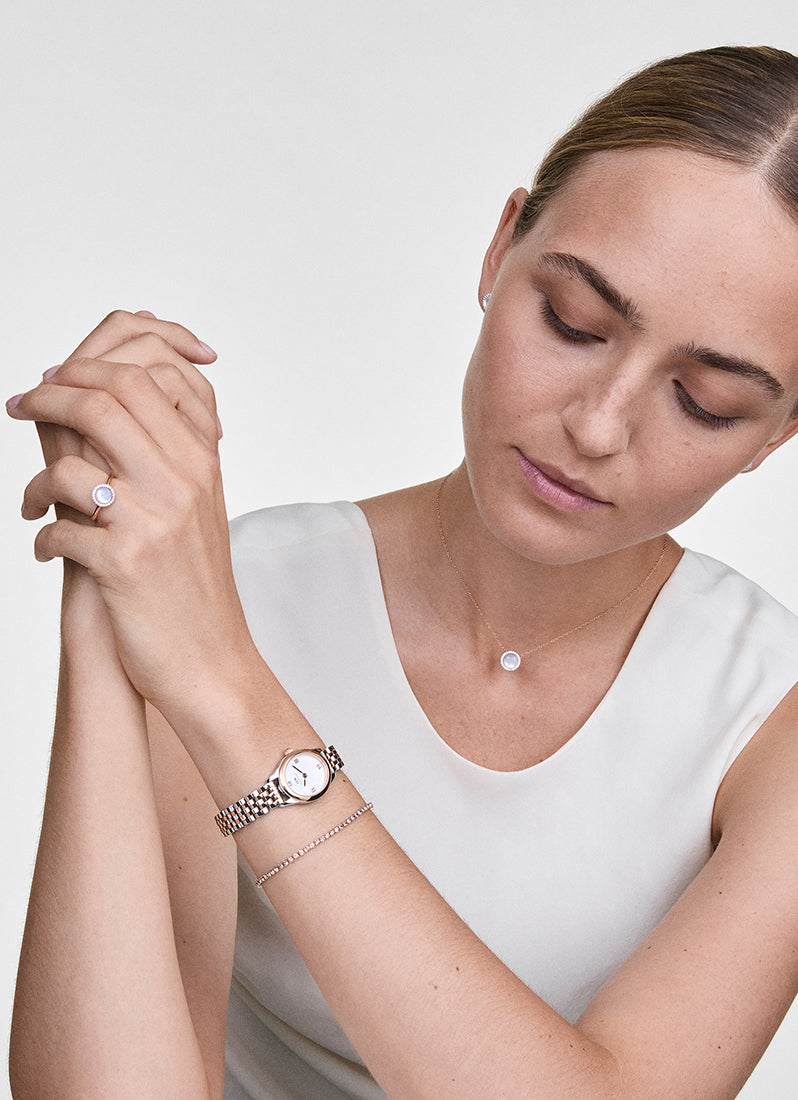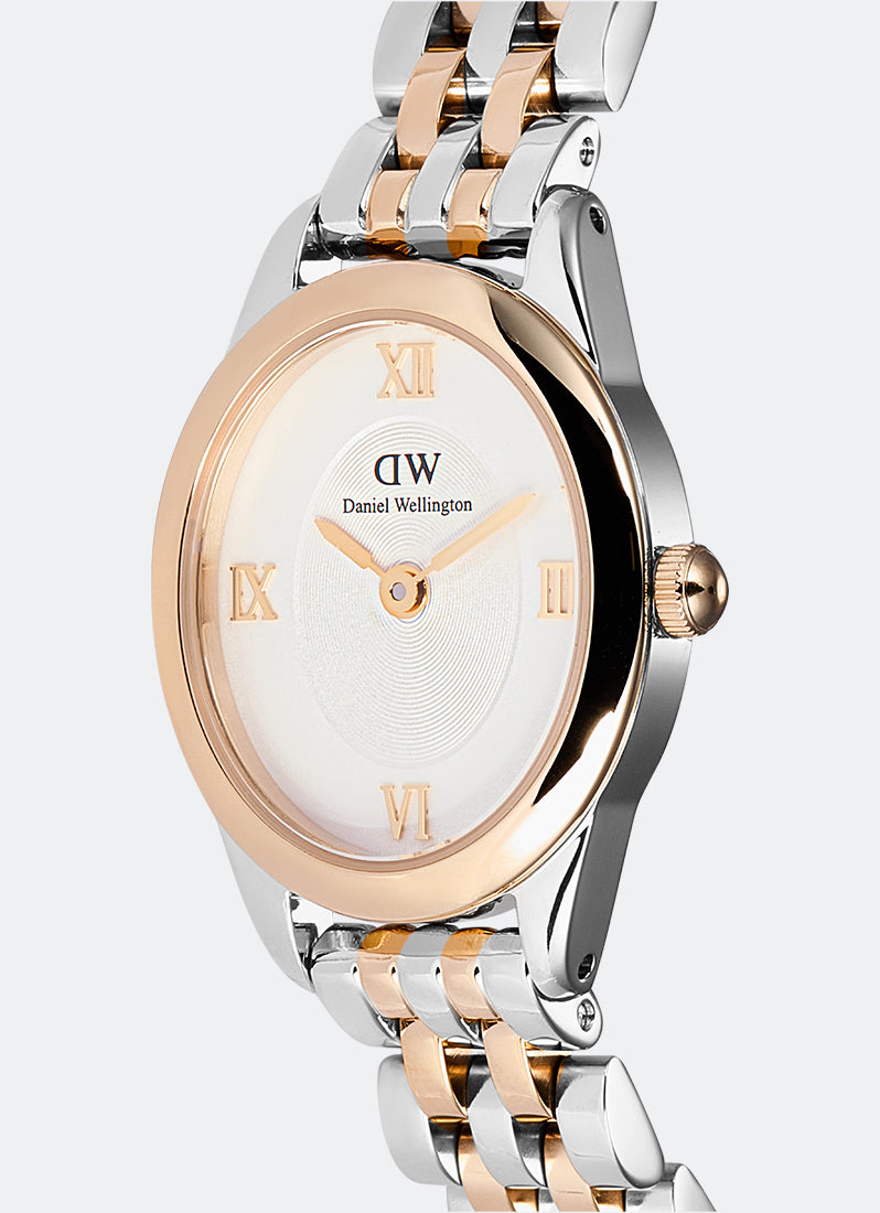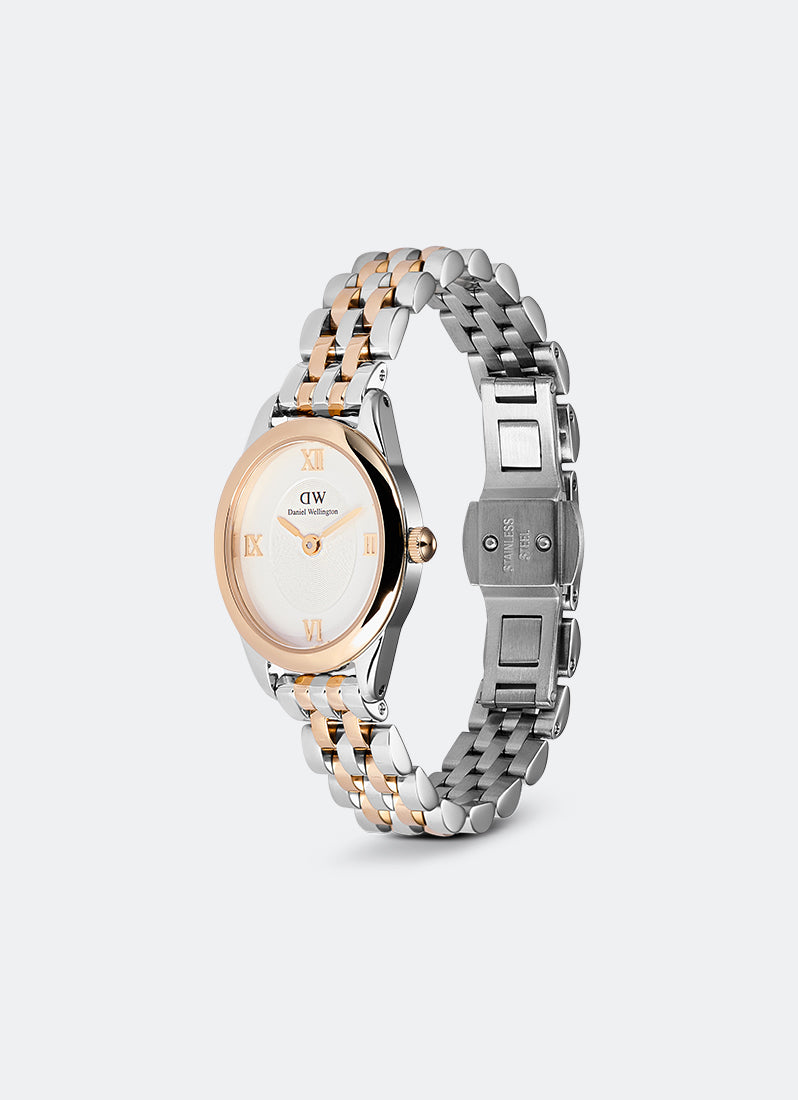 The Ophelia Mini Watch features a dial with an elegant oval shape that diverges from traditional watches. This one-of-a-kind new female watch offers a lot of newness. It comes with a newly designed beans link strap and a butterfly buckle. The slightly heavier oval case enhances its elegant silhouette, while the tapered lugs ensure a smooth transition to the link bracelet. The watch boasts metal Roman numerals atop a disc pattern at the center of the sunray dial, and both the case and bracelet are polished to a bold, shimmering finish.