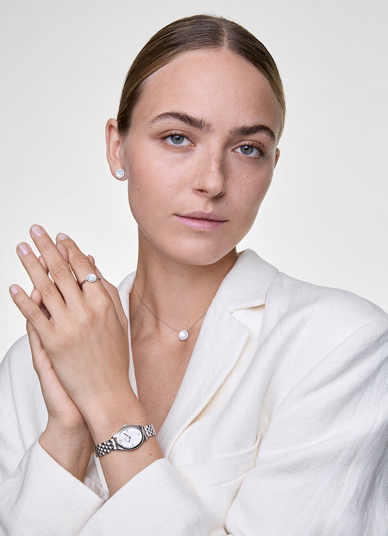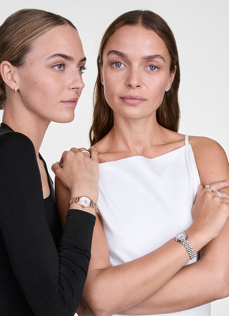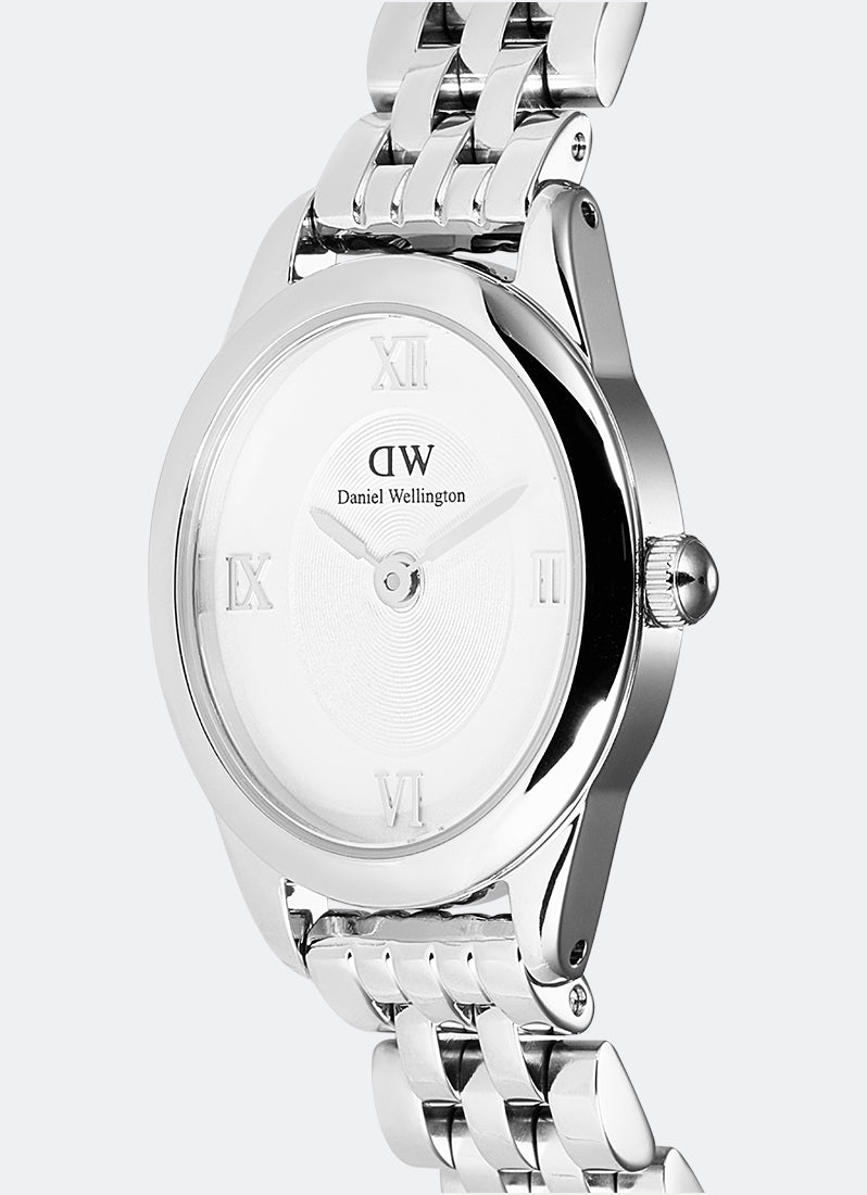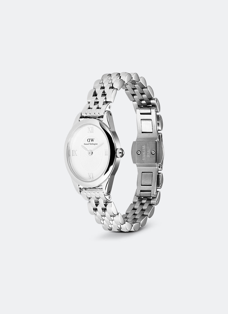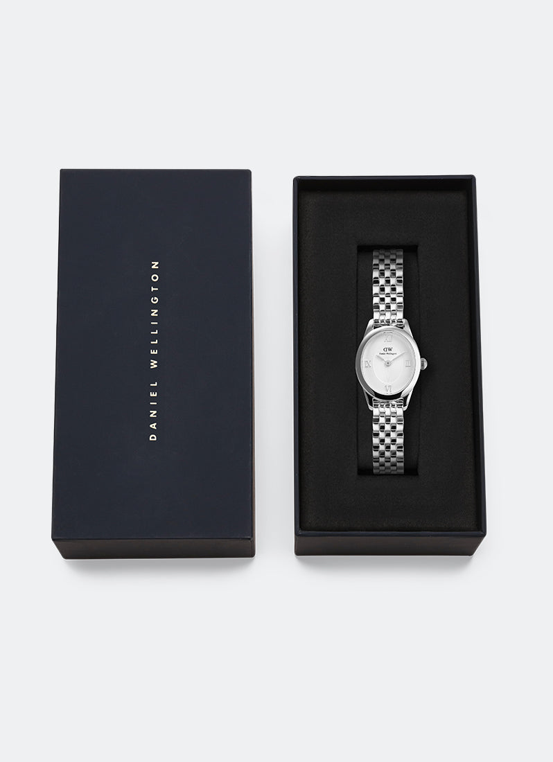 The Ophelia Mini Watch features a dial with an elegant oval shape that diverges from traditional watches. This one-of-a-kind new female watch offers a lot of newness. It comes with a newly designed beans link strap and a butterfly buckle. The slightly heavier oval case enhances its elegant silhouette, while the tapered lugs ensure a smooth transition to the link bracelet. The watch boasts metal Roman numerals atop a disc pattern at the center of the sunray dial, and both the case and bracelet are polished to a bold, shimmering finish.