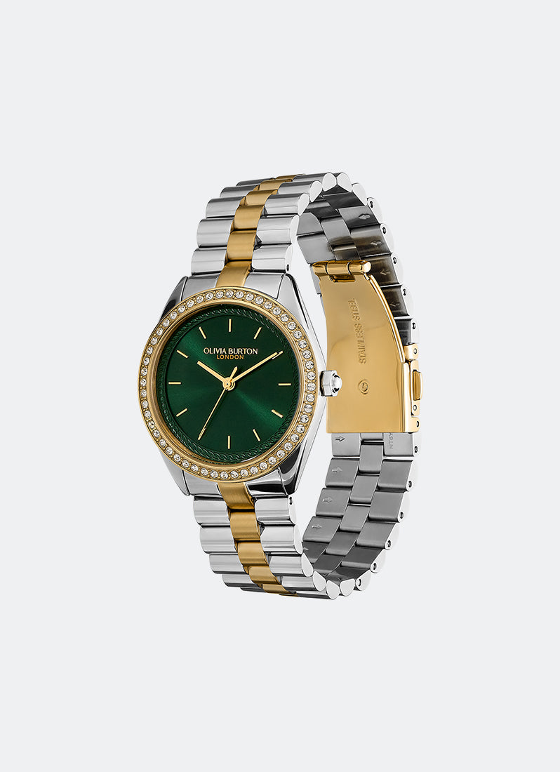 Inspired by our very own chain-link ribbon as well as some of our favourite heritage styles, this Sports Luxe watch is a classic in the making. A gleaming sunray dial in Forest Green is framed by a chain-link border and dazzling crystal bezel for that extra bejewelled touch. Finished with a sporty mixed-metal bracelet strap with a touch of gold, this is definitely the way to wear Sports Luxe.